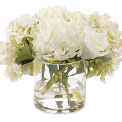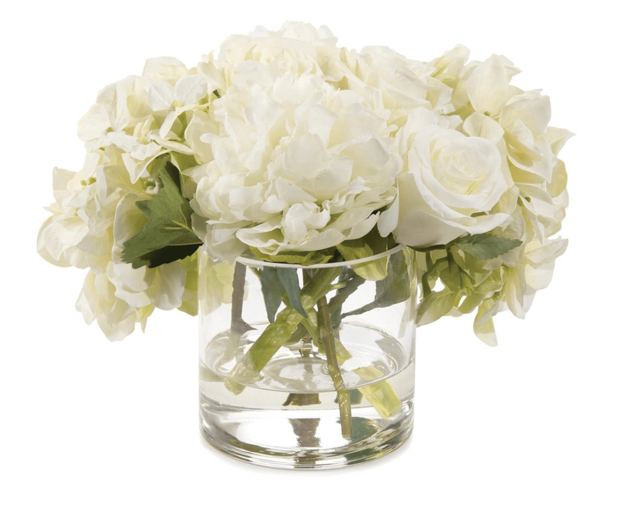 This beautiful cylinder vase is filled with white Annabelle hydrangeas, peonies, and roses in faux water.