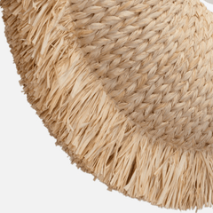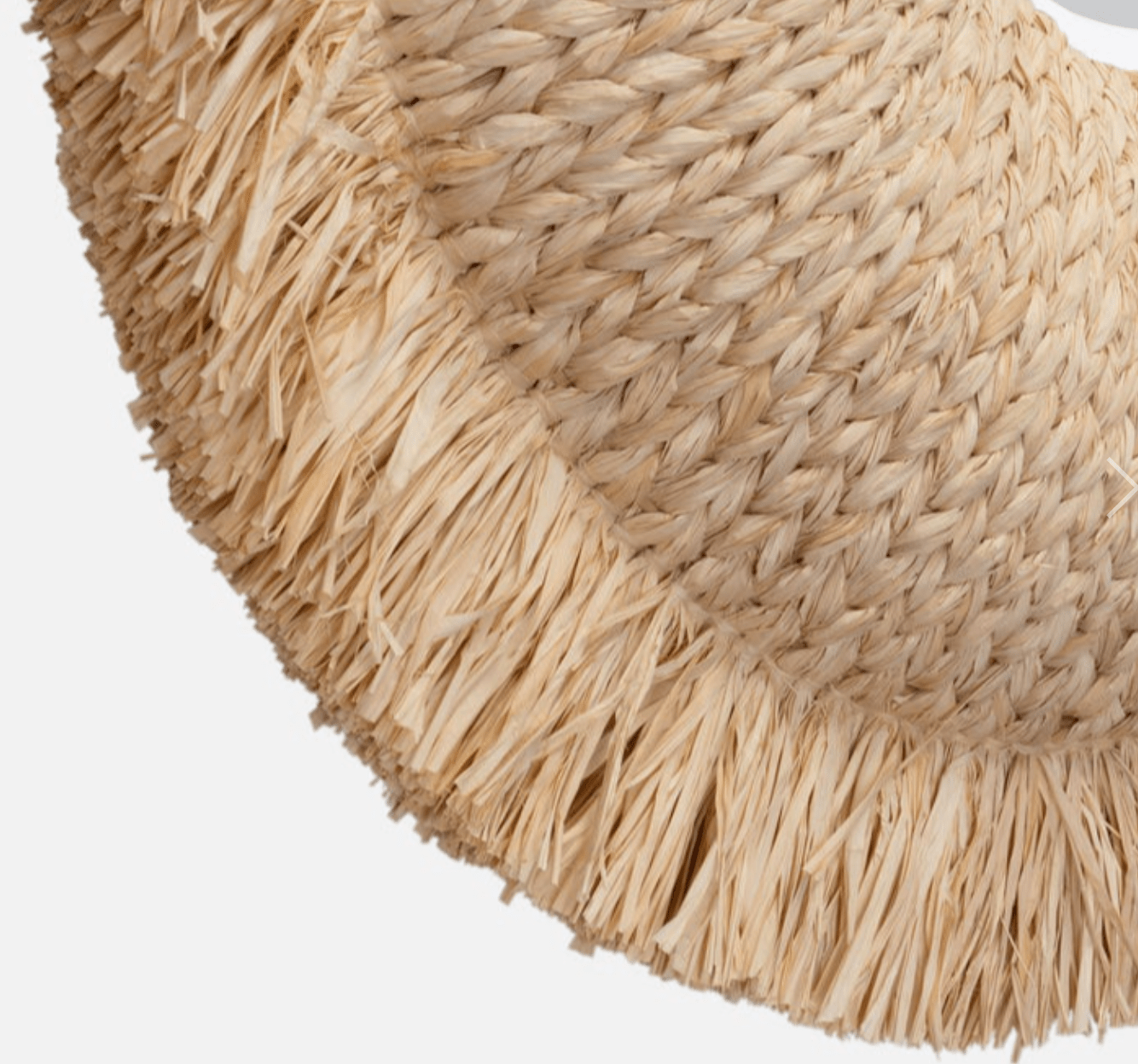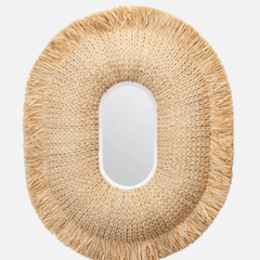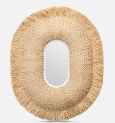 The Winter Park Raffia Oval Mirror is a fun take on a porthole mirror. Woven raffia is braided and set along the raised profile radiating from the center. The end of each braid is tufted to create a lively textured edge. Great for an eclectic bungalow, sunroom, or other bright, casual space.