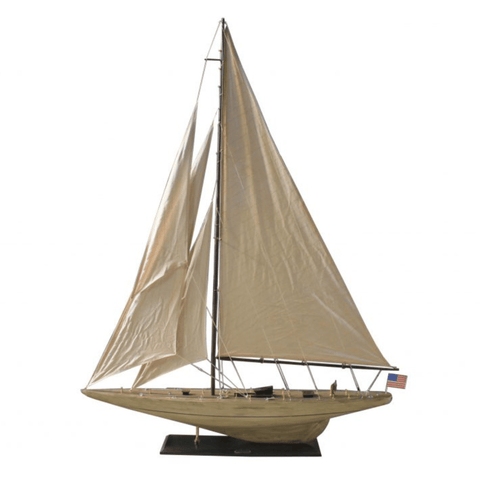 With the wind’s unbound freedom and the graceful speed of the waves, these rustic model sailing ships of America’s Cup winner, racing yacht Intrepid are certain to brighten any room with their presence. As the second-ever winner of back-to-back America’s Cup challenges, this elegant yacht model sails as a perfect highlight for any beach house or bedroom, meeting room or office from atop mantle, shelf or table.