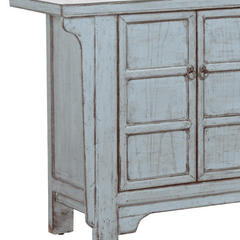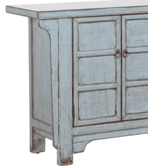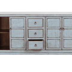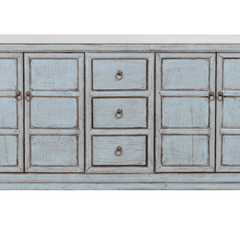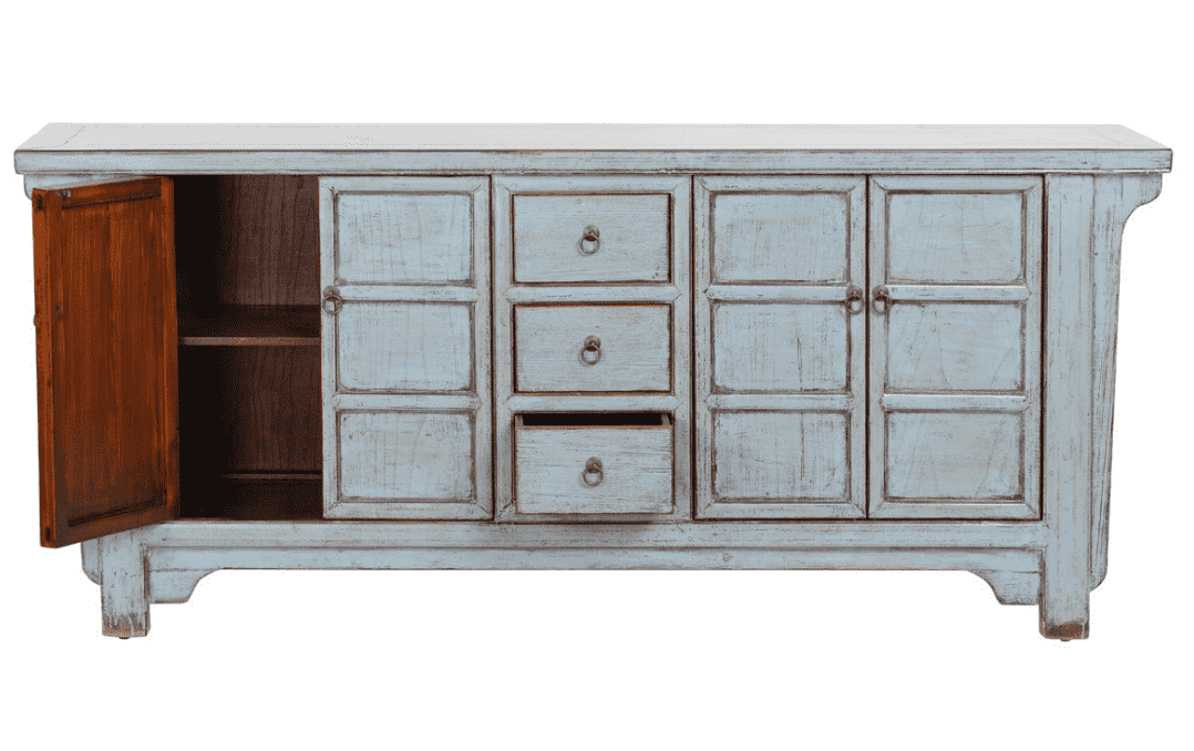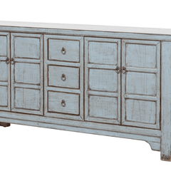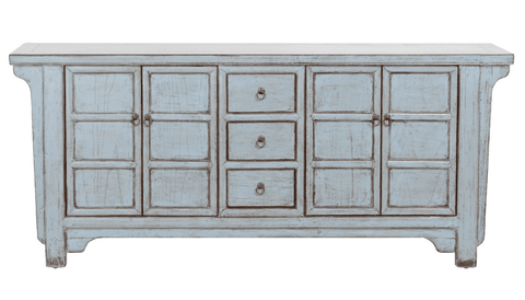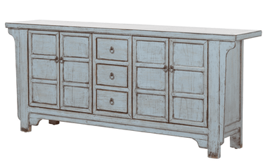 The Croft Sideboard is an Asian inspired piece that is made with reclaimed pine that has been hand finished to give it the look of well used furniture. Two inset cabinets provide generous storage, including fixed shelving for organizing dinner linens, silver, dishes and more. Three central drawers provide additional space, adding functionality to this attractive dining accent piece.